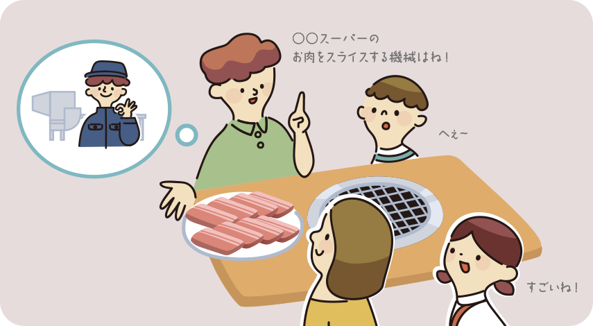 飲食店やスーパー、食品加工工場など、食品に関わる場所であればその多くがお客様となります。様々なところで当社の製品は活躍しているので、家族でお出かけしている時に出会うこともしばしば。そんな時「ここのお肉はお父さんが販売した(作った)機械で切ったんだ!」とよく自慢しています。